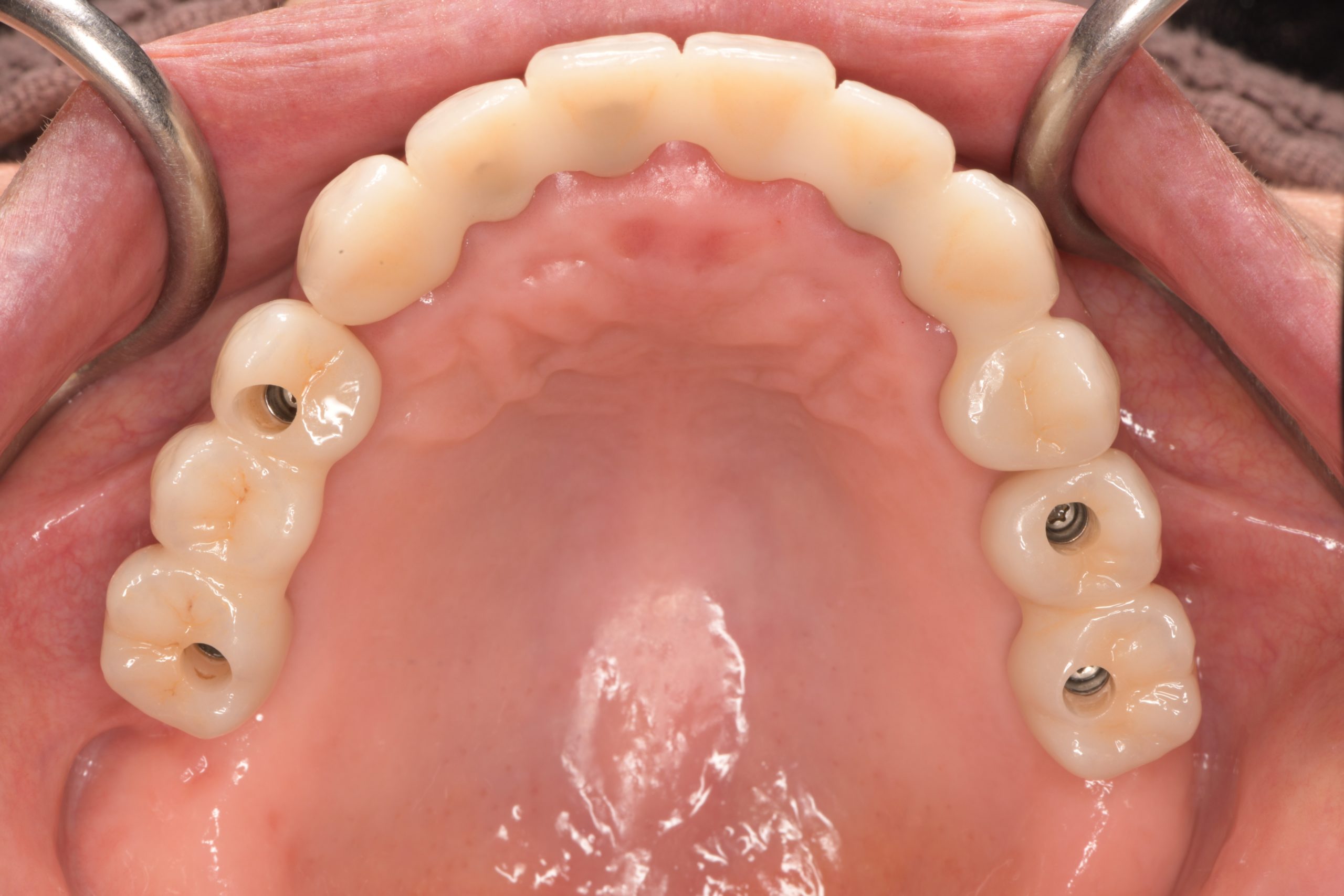 患者様は70代女性。左上の奥歯が取れてしまったことで来院されました。脱落してしまった左上の奥歯は、長い間、鉤歯として義歯を支えておりましたが、過重な負担で歯根破折を起こし、抜歯となりました。抜歯後、患者様より『今までのような入れ歯ではなく、インプラント治療を行い、しっかりと噛めるようにしたい』とのご要望がありましたので、精査を行い、インプラント治療の計画を立てました。ご高齢ということもあり、手術時の侵襲をできる限り少なくするために、フラップレスサージェリー(歯肉に直径4㎜ほどの穴をあけるだけで、行う手術)を選択致しました。 また、古い被せ物の虫歯治療やマウスピースによる歯列矯正もこの機会に治療させていただきました。セラミッククラウンによる治療を行うことにより、プラークの付着がほとんど無い非常に清潔な口腔内となりました。現在、治療完了から5年以上が経過しておりますが、何のトラブルもなく経過しております。今でも患者様は3ヶ月に1回の定期検診にご来院いただいておりますが、その度に『インプラント治療により、硬い物でも何でも噛めるようになり本当に快適です。良く噛めます。あの時治療して本当に良かった。ありがとうございます。』とお褒めの言葉をいただき、大変励みになっております。 |